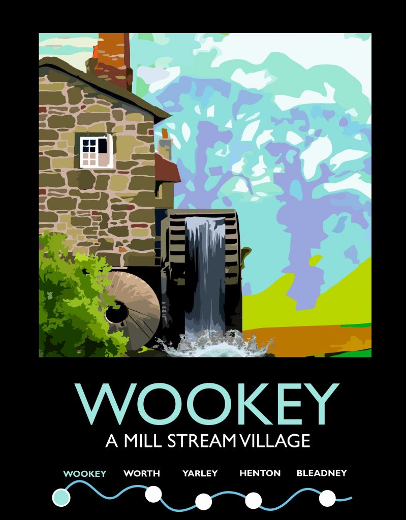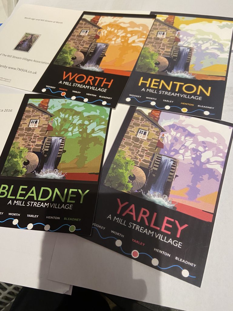 Over the course of several meetings and taking into account comments from many residents the common theme of a mill was settled on as the basis of the picture for the sign. Different background colours and the village name where then applied with each sign having the banner A Mill Stream Village and then under that a stream showing the five dots for the villages and that village’s position along this stream being highlighted.